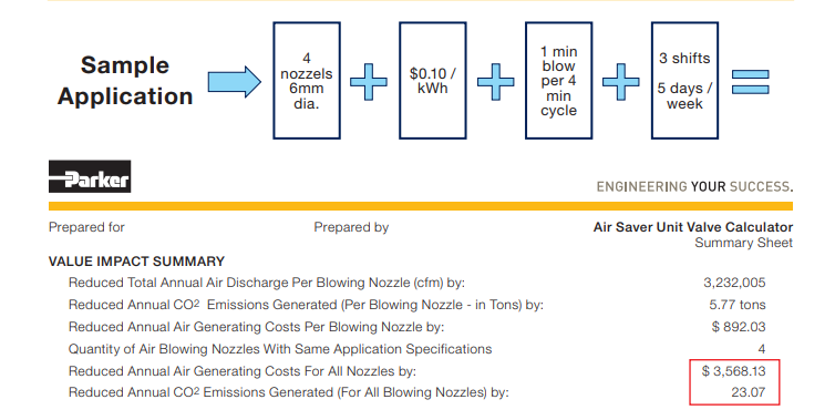 When you consider that air blowing accounts for up to half of all compressed air used in plants, the potential energy, and cost savings is considerable. In the example outlined below, the application of Air Saver Unit on four nozzles with a one minute below per four-minute cycle operating for three shifts, five days per week saved plant operators $3,500 annually.